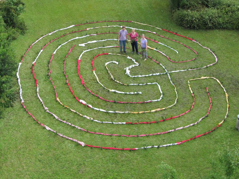 gehbares Labyrinth im PatientengartenAm 25.7.2011 habe ich mit zwei Frauen, Ilka Kleinehellefort aus Neuötting und Vera Bleibinger aus Haiming (siehe Foto) im Simbacher Patientengarten ein großes Labyrinth gelegt (ca 16-18m Durchmesser) - als Dauereinrichtung für unsere PatientInnen und als meditatives Angebot der Krankenhausseelsorge. Ein lang gehegter Traum geht damit in Erfüllung. Das Labyrinth ist ein uraltes Symbol, in dem jeder Mensch seinen Lebensweg nachvollziehen und - als Wallfahrtsweg - nachgehen und meditieren kann. Es gibt nur einen Weg zur Mitte - und wieder zurück. Der Abstand ist - mit 80cm so gewählt, dass auch Menschen mit Rollatoren gut durchgehen können. Der Tag des Hl.Apostels Jakobus wurde beim Errichten des Labyrinths gewählt, weil er der "Wallfahrtsheilige" ist, zu dem viele Menschen nach Santiago de Compostela in Spanien pilgern.